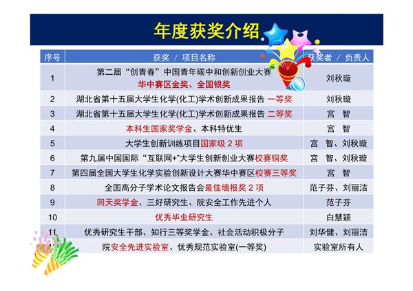 第三,研究生和本科生的培养质量明显提高。白慧颖获得华中科技大学2023级优秀毕业研究生。范子芬获得回天奖学金、三好研究生、院安全工作先进个人、全国高分子学术论文报告会最佳墙报奖。刘华健获得优秀研究生干部、知行三等奖学金。刘丽洁获得全国高分子学术论文报告会最佳墙报奖、社会活动积极分子。x获得本科生国家奖学金、本科特优生、湖北省第十五届大学生化学(化工)学术创新成果报告二等奖。刘秋璇获得湖北省第十五届大学生化学(化工)学术创新成果报告一等奖。刘秋璇、x、覃梦婷、栗倩倩、杨静、王慧悦、温雪莹、韦乾宇、毕思征、王鹏程等人获得第二届“创青春”中国青年碳中和创新创业大赛华中赛区金奖、全国银奖。x、刘秋璇、唐艳秋、毕思征和白慧颖获得第九届中国国际“互联网+”大学生创新创业大赛校赛铜奖。x、刘秋璇和黄雅韵获得第四届全国大学生化学实验创新设计大赛华中赛区校内选拔赛三等奖。x和刘秋璇分别获得国家级大学生创新训练项目。