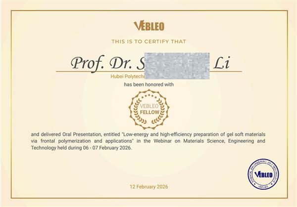 2026年2月12日,课题组李胜方教授被授予国际科学组织Vebleo协会会士(Vebleo Fellow),并于2026年2月6日受邀Vebleo协会主办的材料科学、工程与技术国际会议上作了题为“Low-energy and high-efficiency preparation of gel soft materials via frontal polymerization and applications”的特邀报告。
