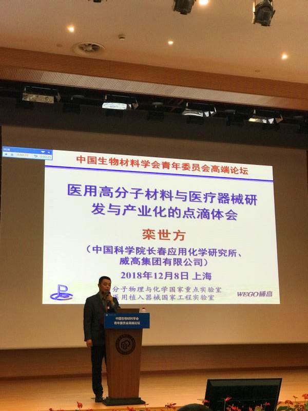 2018年12月8日,栾世方研究员受邀在中国生物材料学会青年委员会高端论坛上作《医用高分子材料与医疗器械研发与产业化的点滴体会》邀请报告