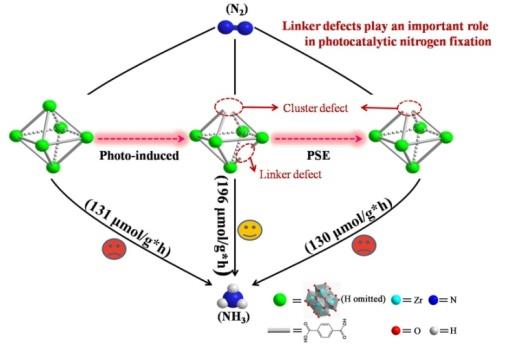 英文摘要:The vacancies of semiconductor have been proven to be effective active sites for photocatalytic nitrogen fixation, but what about the role of defects in MOF materials? Here we report the first UiO-66 with photo-excited cluster defects and linker defects for photocatalytic nitrogen fixation. It''s determined through the post-synthetic ligand exchange (PSE) process that the linker defects rather than cluster defects can greatly improve the performance, which due to the linker defects formed unsaturated metal nodes like the vacancy in semiconductor. Specifically, for photo-activated UiO-66, the NH4+ production rate was 196 and 68 μmol g-1 h-1 in air atmosphere under Ultraviolet-Visible (UV-vis) and visible light, respectively. This report provides a new effective strategy to design efficient nitrogen fixation photocatalysts.