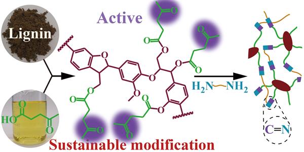 Here we report a new and facile strategy of lignin modification with sustainable levulinic acid to introduce active ketone group. The obtained lignin derivativeexhibited significantly improved solubility and could be utilized to produce polymers such as high-performance polyimine thermosets via Schiff base reaction with diamines.