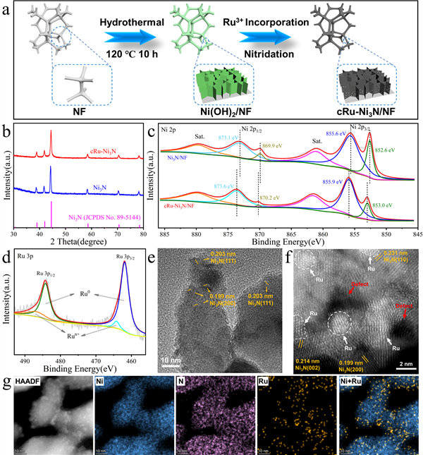 图2. (a)cRu-Ni3N异质结构的合成示意图;cRu-Ni3N的(b)XRD谱图、(c-d)XPS拟合分峰、(e-g)电镜表征结果。