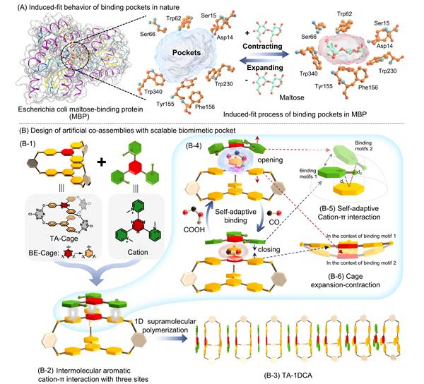 近日,受天然蛋白质(如大肠杆菌麦芽糖结合蛋白)中芳香π-box口袋诱导拟合(induced-fit)机制的启发,课题组在前期可控阳离子–π化学构筑超分子聚合物的基础上,通过大尺寸三角棱柱形分子笼与三臂三嗪阳离子在阳离子–π作用导向下共组装构筑含可扩展仿生口袋的一维共组装体(TA-1DCA与BE-1DCA)。阳离子–π相互作用具有显著的自适应性,并与大分子笼的协同“扩张—收缩”响应相耦合,使仿生口袋周围芳香阳离子的空间位置与翻转取向能够随 C1中间体的尺寸及电子环境变化而动态调节,从而实现对不同关键中间体的有效匹配与稳定,并进一步将质子耦合电子转移(PCET)过程定向引导至单一反应路径。具体而言,TA-1DCA的富含三嗪口袋可提供电子密度并有效稳定*CO中间体,进而完成八电子还原生成CH4,其选择性达95.8%,产率超过90 μmol g-1 h-1。相比之下,BE-1DCA 缺乏上述电子供体位点,难以有效捕获*CO中间体更易释放CO,因而表现出79.9%的CO选择性及约67 μmol g-1 h-1的生成速率。上述研究成果为复杂超分子体系的仿生设计拓展了新思路,而且为先进超分子功能材料的制备和调控提供了新途径。