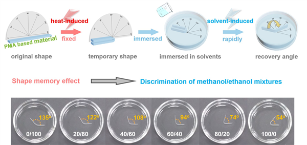 A biomass-derived and biocompatible poly(L-malic acid) (PMA) based material with shape memory effect (SME) was developed in this work. 1,8-octanediol was used as the cross-linker to construct crosslinking networks with hydrophilic backbone chain of PMA, tuning the density of networks and their swelling capacities by controlling -COOH/-OH ratios. The solvent-induced SME of as-obtained cross-linked PMAs was activated at mild conditions in this way. Using the shape recovery levels of U-shaped samples as the probes, the mixed methanol/ethanol/water systems with various ratios could be easily discriminated because the cross-linked PMAs show different sensing capacities to different components. The mechanisms were then studied in terms of the solvent molecule-polymer interactions. This work provides an interesting approach of visible discrimination of the solvents with similar structures, or their mixtures with various ratios, and also opens applications of biocompatible shape memory polymers in biomedical and chemical industries.