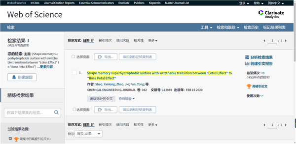 课题组一篇润湿性调控方向的论文(Shape memory superhydrophobic surface with switchable transition between “Lotus Effect” to “Rose Petal Effect”)有幸入选ESI高被引。